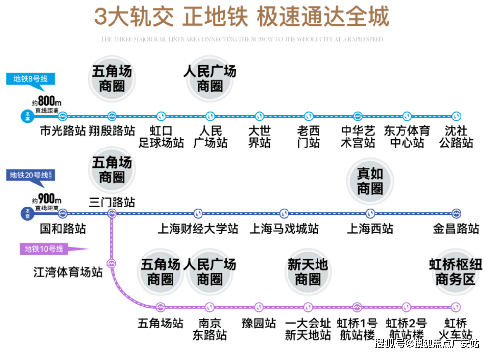 直线号线号线号线三门路站,串联起五角场、虹口足球场、静安、人民广场、新天地、淮海路等核心商圈。