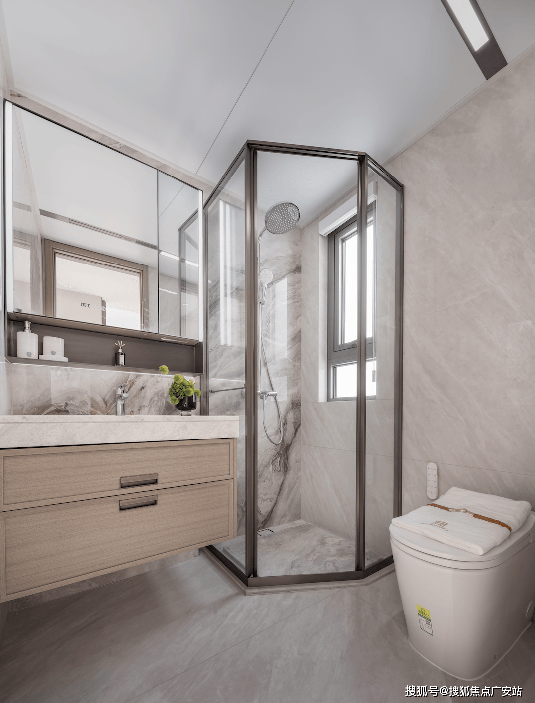 主卧套房式设计,约3.2m的主卧面宽,包括独立的卫浴和飘窗,演绎宽裕尺度。主卫中含大牌恒温花洒、洁具,魔镜内含美妆冰箱:高清镜面,恒温冷藏。